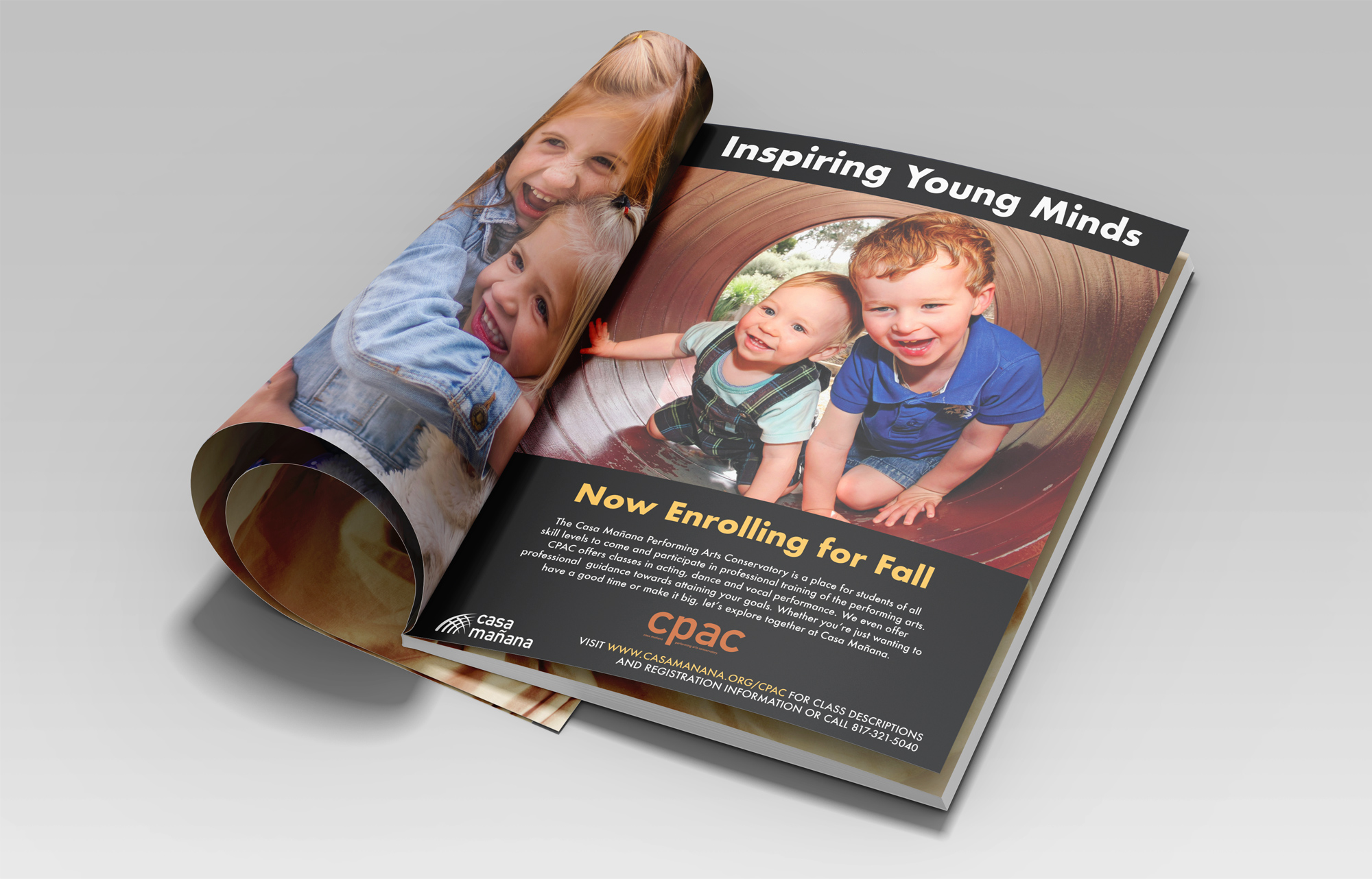 Casa Manana's Conservatory (CPAC) progam prepares tomorrows stars for the spotlight. In addition to advertising spring and fall enrollment, print creative is needed at specific intervals throughout the year to advertise the existance of CPAC to the general public. I was given the task to provide attractive ads for use in publications such as Fort Worth Child and Fort Worth Weekly.