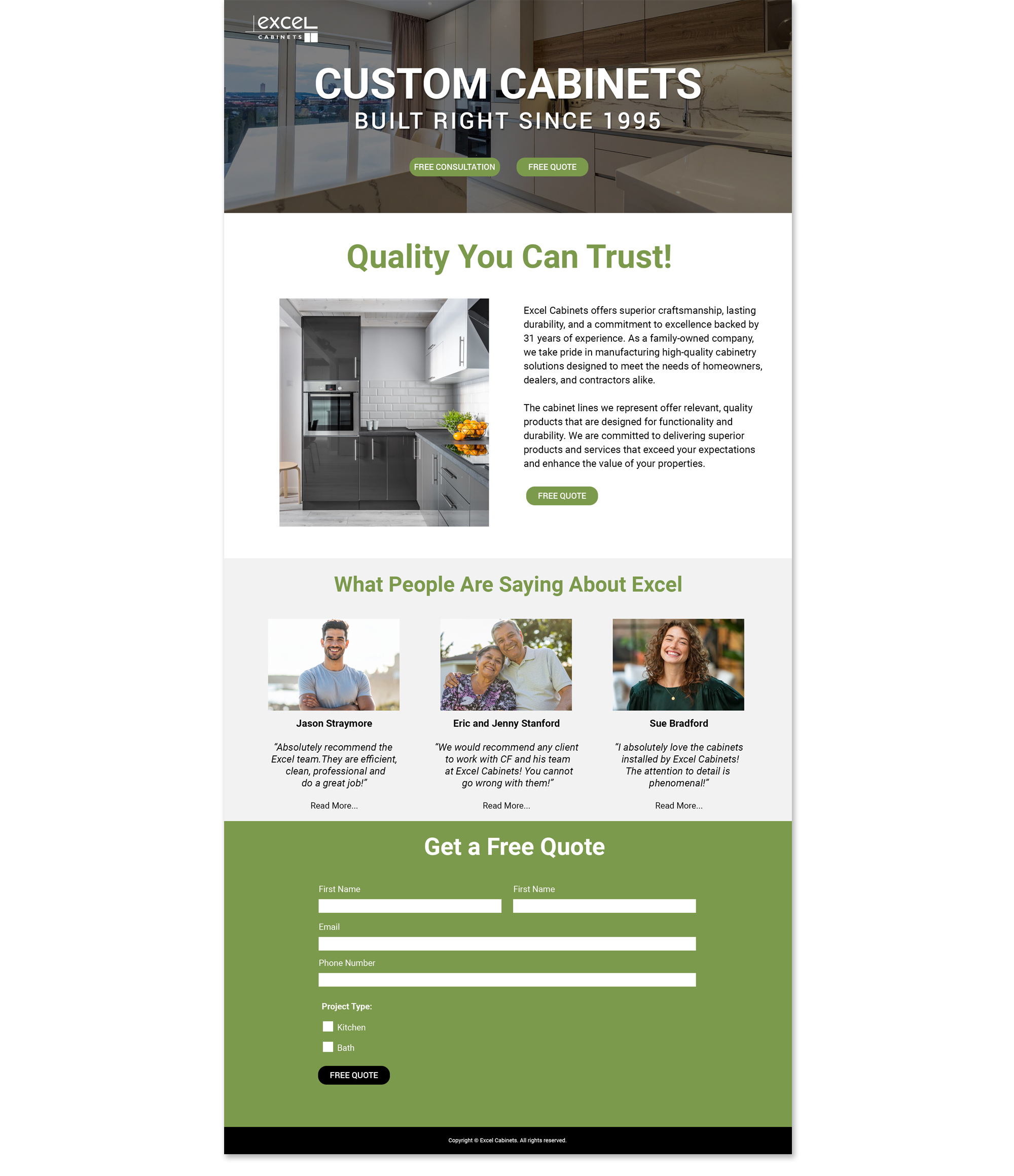 In order to attract more targeted traffic, I recommended the creation of highly focused landing pages designed to target specific services and keywords. To help the client visualize my ideas, I designed a high quality mockup for a landing page that promoted Excel’s cabinetry service.
