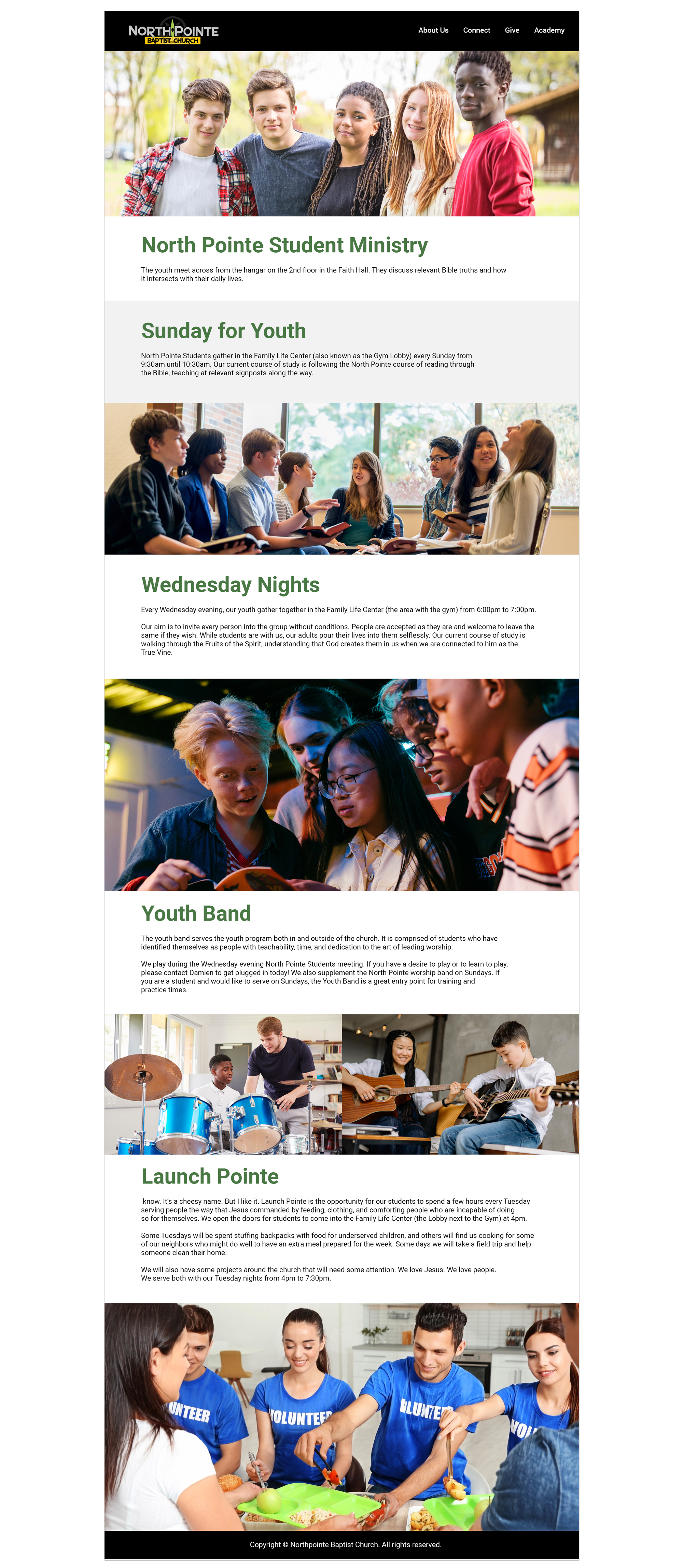 Since I had already updated some print materials for North Pointe in the past, the color scheme has pretty much locked down. The main objective was to develop a modern design that users could navigate easily.