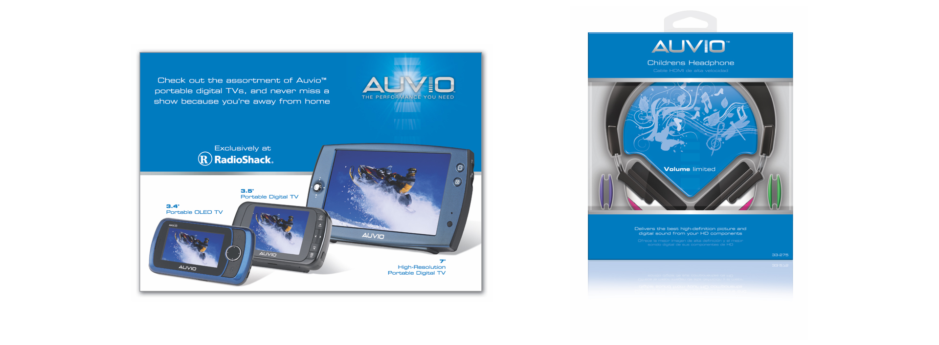 Bold, sexy and unique, the look of the packaging communicates an undeniable sense of quality. An AUVIO foil stamp was utilized to create reflectivity and add additional flair to the packaging designs. For POP and flier designs, the AUVIO logo was enhanced slightly to emphasize the high-end image of the AUVIO brand. The AUVIO product line included everything from high-end cables to portable TVs.