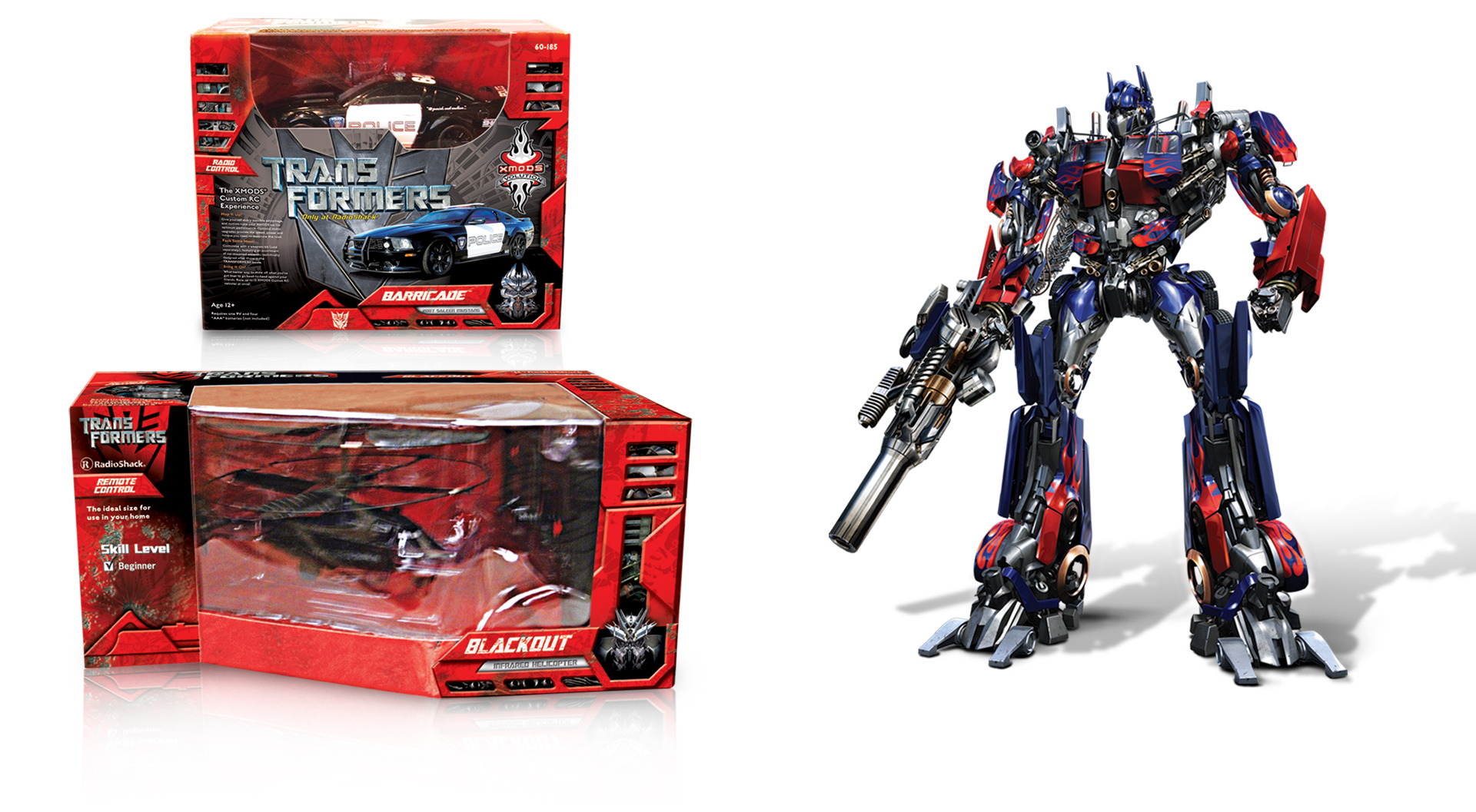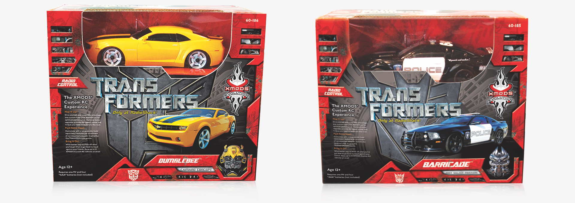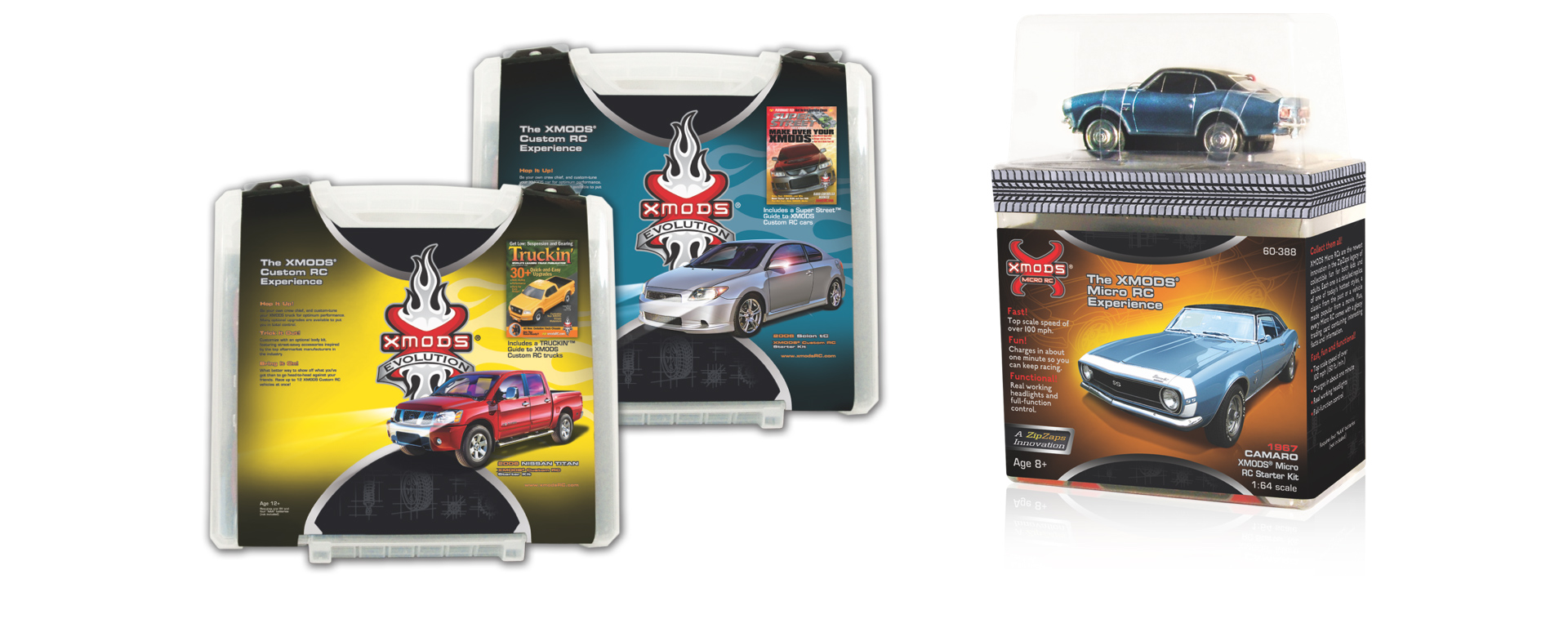 XMOD micro RCs were targeted toward collectors. The packaging for this group was more upscale. A blueprint motif and warm glow were used to evoke a feeling of nostalgia. The XMOD Evolution line showcases new model cars and is directed toward teenagers. These designs used a street tattoo motif to emphasize the fun of street racing. The main objective of the Transformers XMODS was to create an edgy box that showcases the product. The XMOD product line consisted of over a hundred skus.