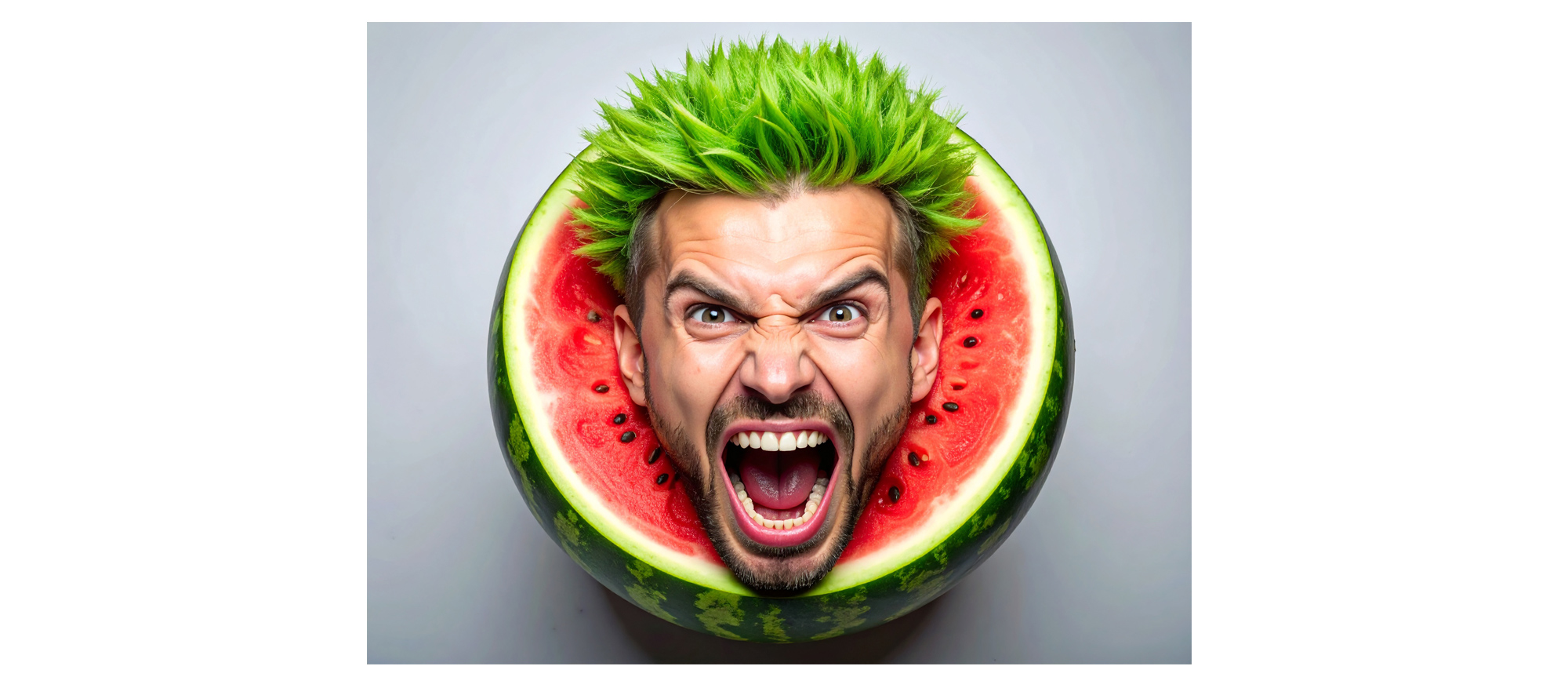 “Floating hyper-realistic watermelon head with weathered male facial structure emerging from the rind, mohawk sculpted from spiky hair fibers, macro focus, detailed textures, photographed like a surreal fashion editorial. ”