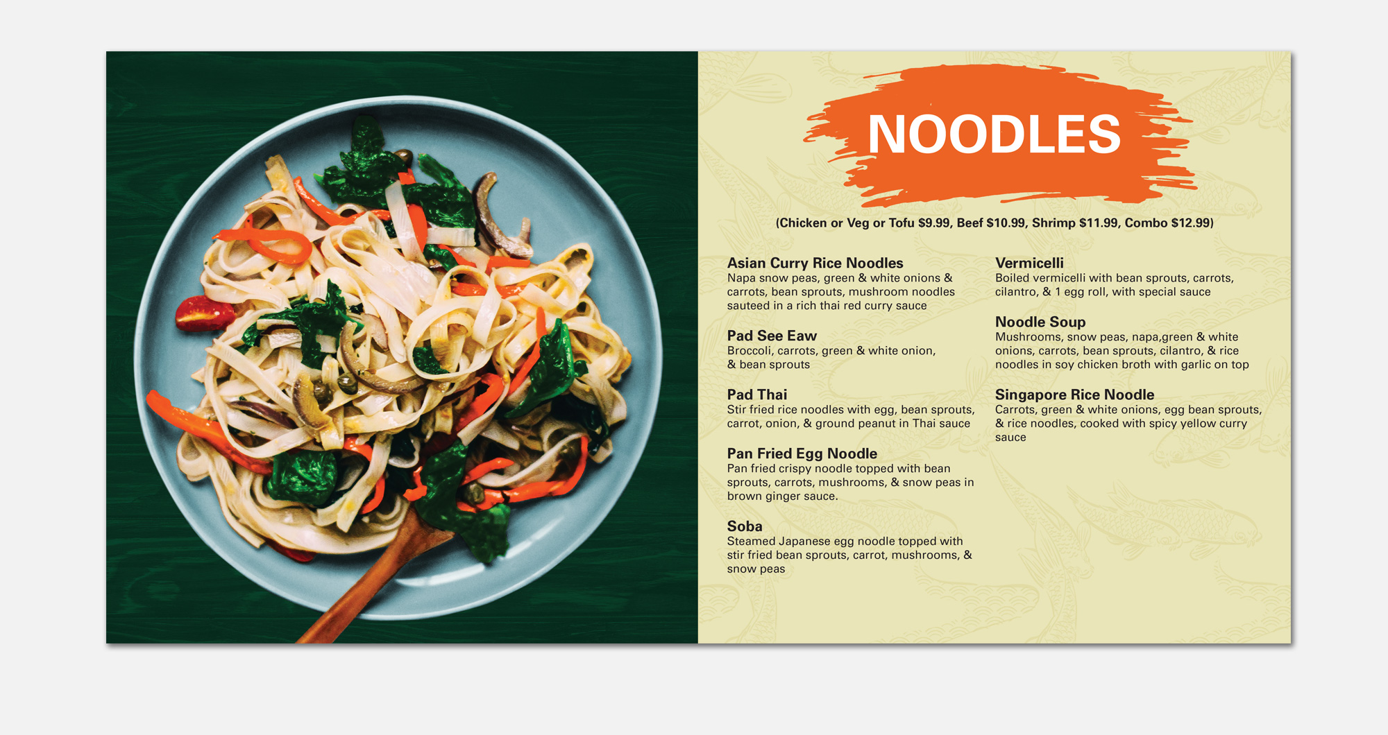 Taste of Asia, a multi-cuisine restaurant blending Thai, Japanese, and Chinese offerings, partnered with Pixelsfx Studio to strengthen its brand identity and customer engagement strategy. My role focused on developing a visually cohesive brand system. This system consisted of a logo, menu design, and color palette that communicated cultural authenticity while improving menu navigation and purchase intent.