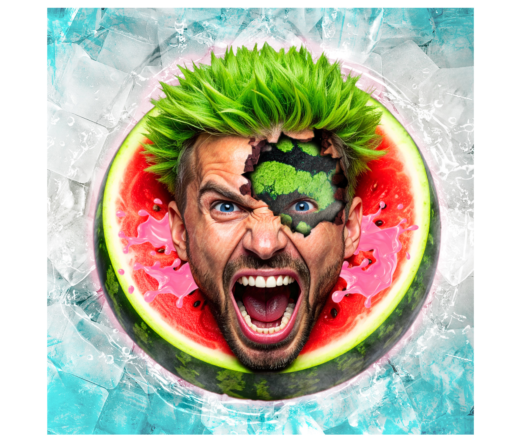 “Floating hyper-realistic watermelon head with weathered male facial structure emerging from the rind, mohawk sculpted from spiky hair fibers, macro focus, detailed textures, photographed like a surreal fashion editorial. ”